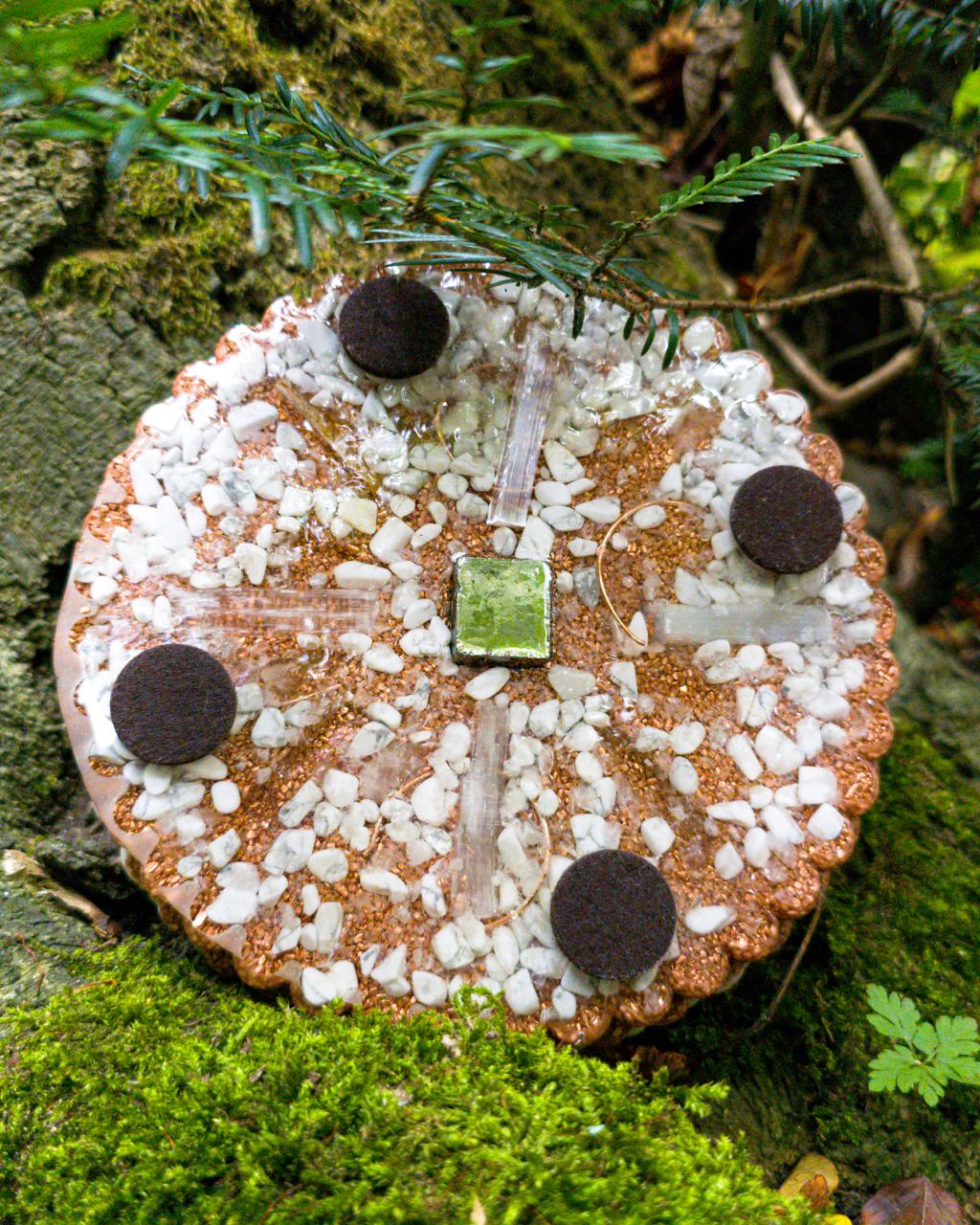 The metals gold, iron, aluminium and copper granules repel the energies that are attracted bio the carbon based epoxy resin. The copper coils and clockwise spirals give a direction to the orgonite so the output of the orgonite is in harmony with your natural balance.