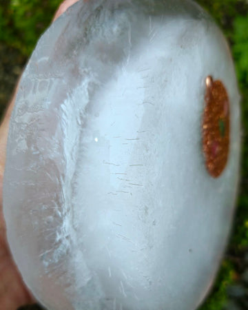 The last photo slides, you can see aura photo's from before and after wearing the pendant, and the freezer test. When you place the orgonite in a container of water and you place this in the freezer, the day after you take out the container and the visible white patters are the frozen orgone energy. These are great ways to make the invisible, visible.